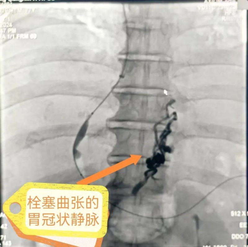 术前与患者及家属积极沟通、完善各项术前准备后,12月2日在麻醉科医师王冠男保驾护航下,刘建带领团队成员李洪宇,介入导管室技师郑红云、护士卢薇密切配合,在全麻下为李大爷行经颈静脉肝内门-体分流术+胃底静脉栓塞术。手术穿刺顺利,先经皮穿刺右侧股动脉,在导丝引导下插入腹腔干动脉内,使用造影剂明确门静脉的走行。门静脉造影显示:门静脉增宽,可见一支粗大的冠状静脉扭曲增粗远端食管胃底静脉增粗曲张。