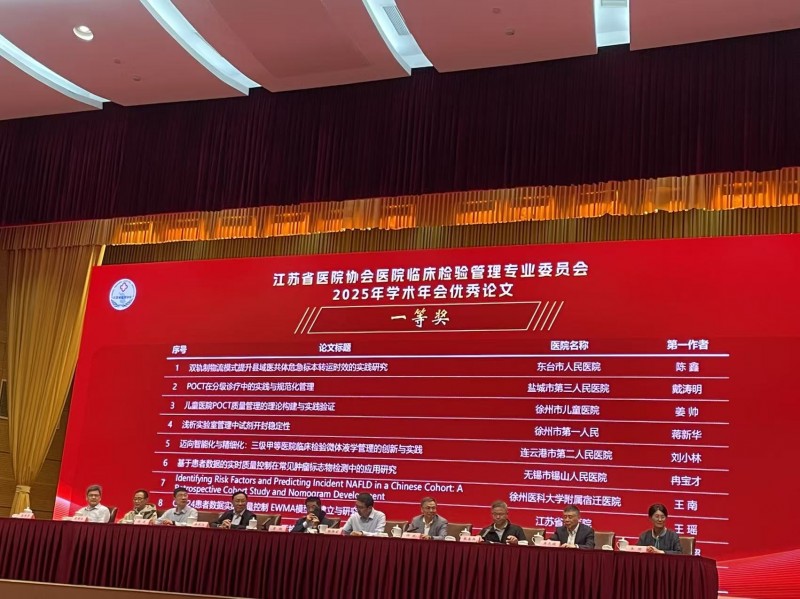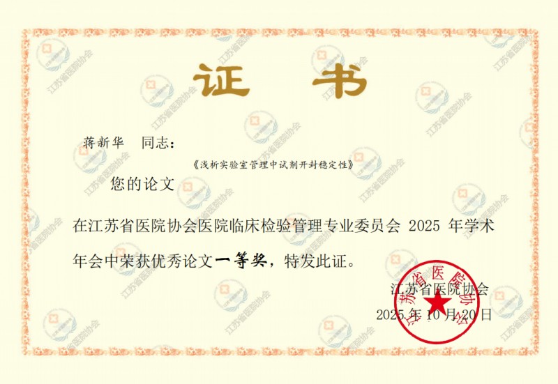 从江苏省医院协会临床检验管理专业委员会2025年学术会议获悉,徐州市第一人民医院医学检验科主任技师蒋新华在科主任、学科带头人王丽教授的悉心指导与带领下,《浅析实验室管理中试剂开封稳定性》荣获优秀论文一等奖。此次获奖,是医学检验科在江苏省临床检验管理方面突出的有力见证,同时也标志着专科建设和学术水平得到了省内同行的充分认可,更是徐州一院医学检验科高质量发展的最佳诠释。