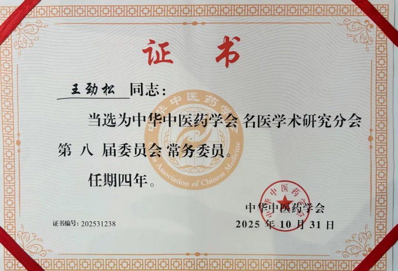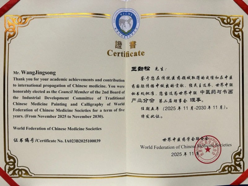 在随后于北京举行的“世界中医药学会联合会中医药与书画产业分会换届选举大会”上,王劲松教授被推选为世界中医药联合会第二届中医药与书画产业分会理事