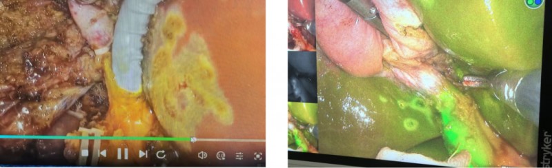 了解患者诉求后,普外·肝胆胰外科主任宋兴超教授带领团队评估病情后,立即决定采用更先进的两孔法腹腔镜胆总管探查取石术。该技术仅需在患者脐部建立1.0cm、剑突下建立0.5cm的两个微小切口,通过荧光腹腔镜的精准引导,借助特殊微创器械完成结石探查、抓取、冲洗等操作,术后仅留置一根腹腔引流管,并未放置T管,避免患者长期留置管道的痛苦。