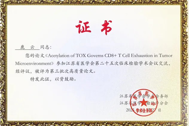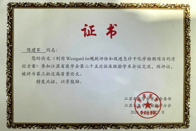 在优秀论文交流会场中,徐州市第一人民医院医学检验科鹿云、陈建军的论文被评为高质量论文并在分会场作口头报告,获得与会专家高度评价。