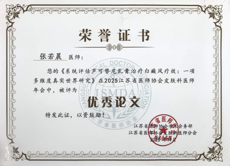 在南京举办的“2025江苏省医师协会皮肤科医师年会”上,徐州市第一人民医院皮肤科医师张若晨博士在其导师张学军教授指导下,以《系统评估芦可替尼乳膏治疗白癜风疗效:一项多维度真实世界研究》为题,进行了专题分享,展现了扎实的科研能力与专业的学术风采。凭借前沿的临床研究成果,该论文荣获“优秀论文”奖。