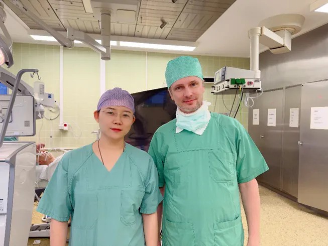 我所在的这家医院是德国第三大大学医院,其眼科中心以其高度的专业细分和顶尖的技术实力著称。我的导师Lytynchuk教授,是一位将微创艺术与现代科技完美融合的外科大师。在这里,我最重要的收获之一,是见证了“精准”二字在眼科手术中的极致体现。在Lytynchuk教授的手术室里,3D显微手术系统与术中实时OCT(光学相干断层扫描)的联用,将手术视野从平面变成了有景深的立体空间,OCT就像一双“透视眼”,能实时显示视网膜每一层的横断面影像,让每一次分离与操作都精准无误,真正实现了“所见即所治”,极大提升了复杂眼底手术的安全性与成功率。这种将顶尖设备深度整合、服务于临床精准决策的理念,让我印象深刻。