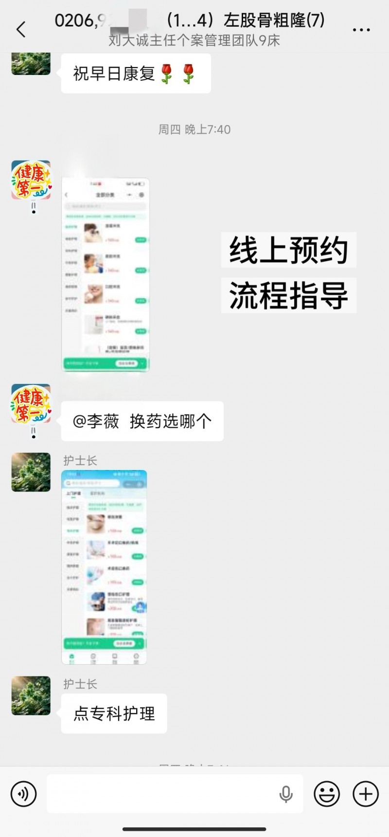 宋阿姨出院3天后,家属通过由个案管理师、医疗、护理、康复师等共同组成的“多对一”个案管理微信群与医护人员取得联系,在李薇护士长的耐心指导下,通过“彭城家护”平台成功预约了上门护理服务。