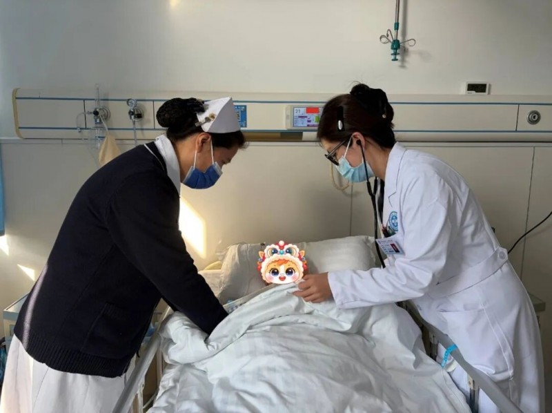 王叔叔(化名)是科室春节期间收治的重症肺炎患者。胡雪婷医生俯下身,用听诊器仔细检查他的呼吸情况,刘浩文护士则在一旁细心整理床单元,动作轻柔又利落。