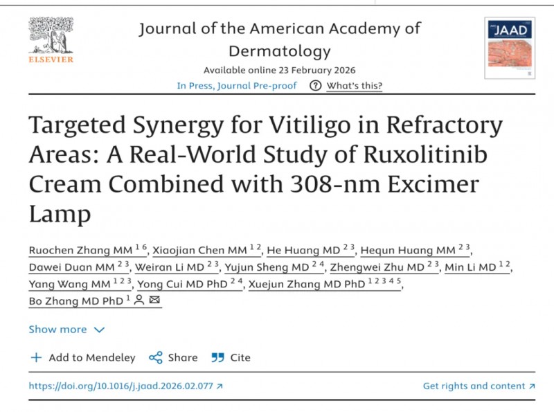 近日,徐州市第一人民医院皮肤科张若晨博士(唯一第一作者)的研究成果“Targeted Synergy for Vitiligo in Refractory Areas: A Real-World Study of Ruxolitinib Cream Combined with 308-nm Excimer Lamp”在国际皮肤科领域排名第一的期刊《Journal of the American Academy of Dermatology》(中科院1区,影响因子12.8)上正式发表。