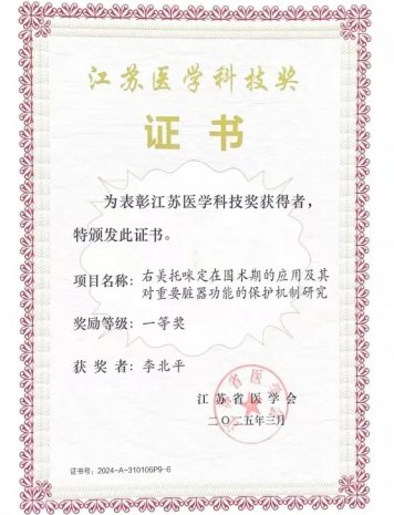 近日,在江苏省医学会2025年工作会议暨2024年江苏医学科技奖颁奖会议上,由徐州市第一人民医院麻醉科主任李北平作为主要成员参与的科研成果《右美托咪定在围术期的应用及其对重...