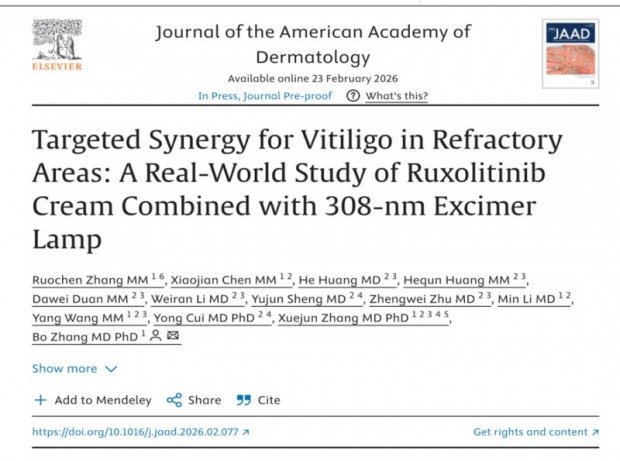 近日,徐州市第一人民医院皮肤科张若晨博士(唯一第一作者)的研究成果Targeted Synergy for Vitiligo in Refractory Areas: A Real-World Study of Ruxolitinib Cream Combined with 308-nm Excimer Lamp在国际皮肤科领域...
