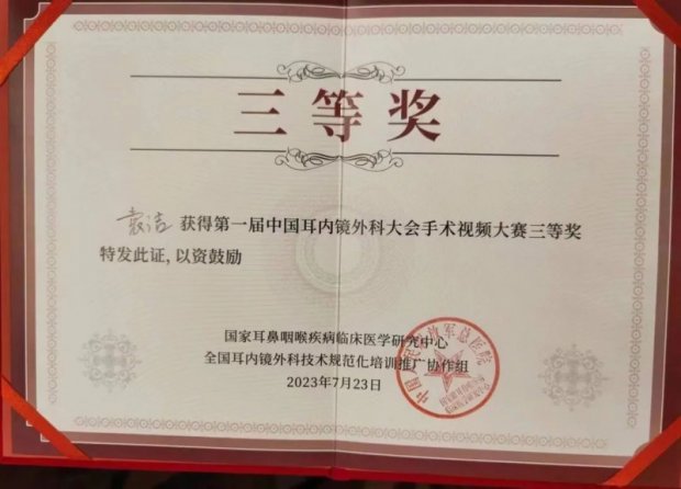 近日,徐州一院耳鼻咽喉科主任医师袁洁在第一届中国耳内镜外科大会上荣获耳内镜手术视频大赛三等奖。...