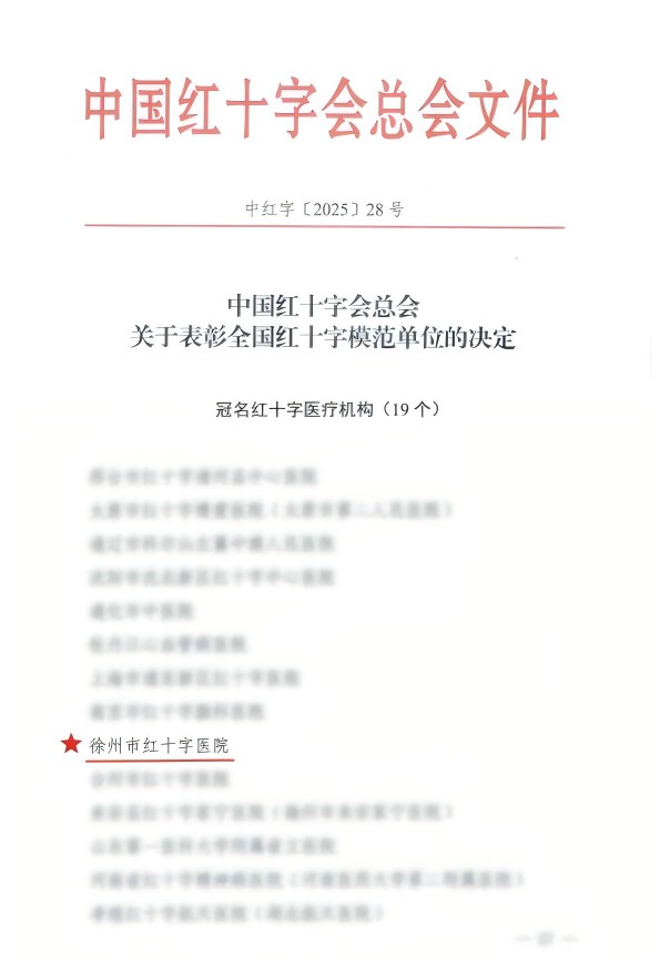 近日,中国红十字会总会发布《关于表彰全国红十字模范单位的决定》,徐州市第一人民医院(徐州市红十字医院)光荣上榜,荣获“全国红十字模范单位”称号!这是对我院长期以来践行红十字精神、服务人民群众健康事业的充分肯定,也是对全院职工无私奉献、勇于担当的高度认可。