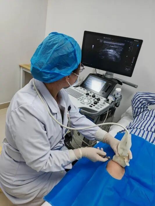 风湿免疫科主任任义乐和副主任医师于佳妮密切配合,在超声引导下,利用微创滑膜切割器,切取滑膜病变组织,留取病理化验。整个操作过程干净利落,仅用15分钟,无出血,术后无任何操作相关的不适。