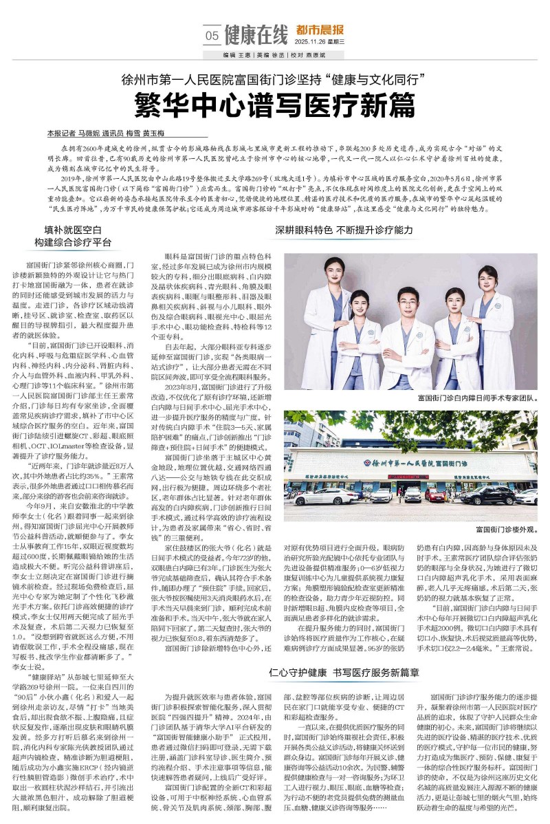 富国街门诊诊疗服务能力的逐步提升,凝聚着徐州市第一人民医院对医疗品质的追求,体现了守护人民群众生命健康的初心。未来,富国街门诊将继续以先进的医疗设备、精湛的医疗技术、优质的医疗模式,守护每一位市民的健康,努力打造成为集医疗、预防、保健、康复于一体的综合性医疗服务标杆。富国街门诊的使命,不仅是为徐州这座历史文化名城的高质量发展注入源源不断的健康活力,更是让“彭城七里”的烟火气里,始终跃动着生命的温度与希望的光芒,共绘健康彭城新图景。