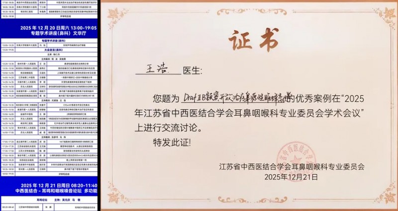 2025年初冬的张家港,江苏省中西医结合学会耳鼻咽喉科分会学术会议的会场内,当主持人宣布优秀病例展示环节的投票结果时,一串数字引起了全场关注:“9票”——评审组10位专家,9票赞成,徐州一院耳鼻咽喉科王浩教授团队分享的《DrafⅡB型额窦开放治疗眶蜂窝织炎病例体会》,以近乎满票的绝对优势,从众多参评案例中脱颖而出,拔得头筹。