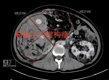 在抢救治疗的同时,急诊医学科值班医护团队仔细评估、完善辅助检查发现,W女士患有罕见的“结节性硬化症”,这是一种常导致全身多器官(如脑、肾、皮肤等)发生良性肿瘤(错构瘤)的遗传性疾病。患者既往有癫痫病史,且5年前曾有过肾错构瘤出血保守治疗史。此次出血的“元凶”正是其右肾一个巨大的血管平滑肌脂肪瘤(即肾错构瘤)发生破裂所致。由于瘤体体积巨大、血供异常丰富且出血凶猛,在当地医院保守治疗无效。腹部CT也证实,患者右肾已被一个约25cm×25cm、占据大半腹腔的巨大瘤体占据并严重变形,正常肾组织几乎被完全挤压取代,腹腔多发扩张迂曲血管影,腹盆腔渗出、积液,情况复杂。若直接进行外科切除手术,术中大出血风险极高,患者很可能无法耐受。