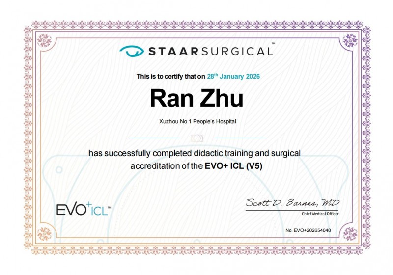 手术的顺利完成,离不开主刀专家深厚的功底与团队的精密协作。作为全国屈光手术领域的权威专家,朱冉教授从事临床工作近三十年,已完成各类屈光手术数十万余例,凭借其深厚的学术造诣与丰富的临床经验,获颁EVO+ICL(V5)晶体手术认证证书。