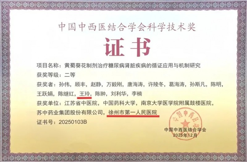 近日,中国中西医结合学会获悉,徐州市第一人民医院肾脏内科主任、二级主任医师王玲团队参与研究的《黄蜀葵花制剂治疗糖尿病肾脏疾病的循证应用与机制研究 》,荣获中国中西医结合学会科技进步二等奖。该奖项的获得,标志着徐州一院肾脏内科在中西医结合治疗肾脏疾病领域迈出了重要一步。