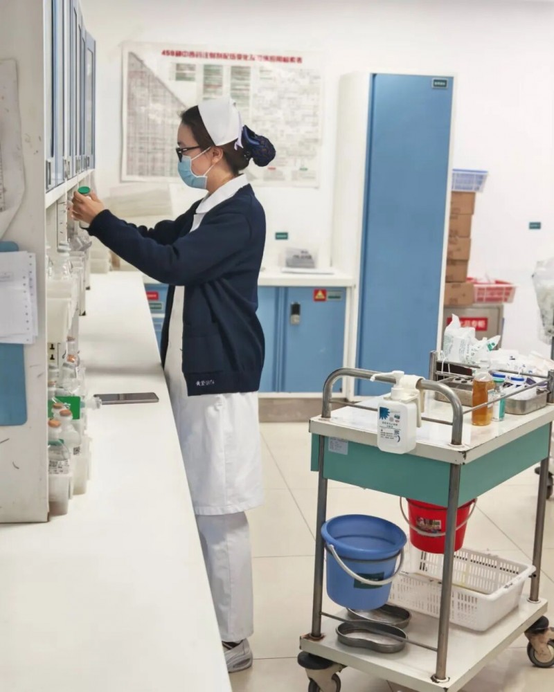 治疗室里,年轻护士黄莹莹正手持输液瓶,严格遵循“三查八对”原则,对着光线仔细核对着每一袋液体的名称及患者信息。她的眼神专注,动作娴熟,用稚嫩的肩膀担起守护生命健康的重任。
