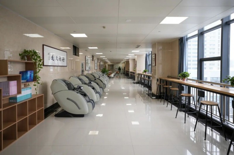 经过精心筹备,这个占地200余平方米的空间被划分为多个功能区:舒适的休息区配备按摩椅和可充电边几;静谧的阅读区摆放了医学期刊和书籍;温馨的交流区设有饮水机和咖啡机。绿植点缀其间,营造出宁静舒适的氛围。