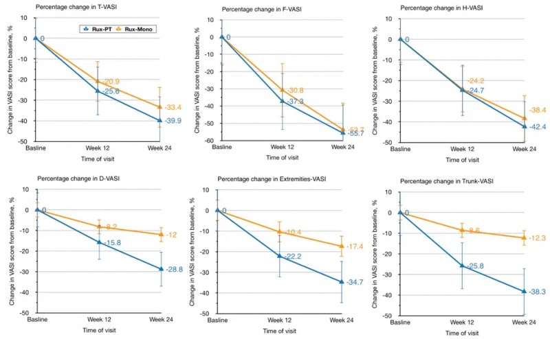 本研究共纳入118例白癜风患者,分别接受芦可替尼治疗(外用每日2次)或联合家用308nm准分子光疗(每周2次)治疗。结果显示,联合治疗组在非头面颈部的难治部位复色效果显著优于单药治疗组:躯干VASI改善率为38.3%vs12.3%,四肢为34.7%vs17.4%,肢端为28.8%vs12.0%。这一发现表明,芦可替尼联合光疗为难治性白癜风提供了新的有效治疗策略。