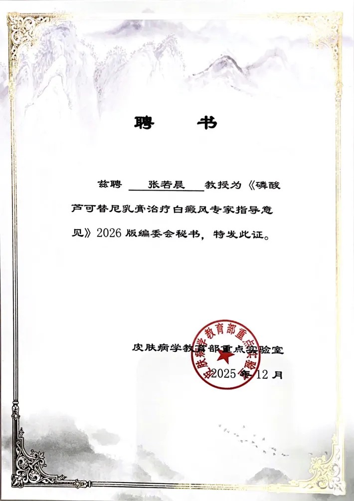 据悉,张若晨博士近年来一直致力于白癜风发病机制及治疗策略的研究,在导师张学军教授的指导下,参与白癜风JAK抑制剂靶向治疗的真实世界研究。此外,张若晨博士还作为编委会秘书,参与编写《磷酸芦可替尼治疗白癜风专家指导意见(2026版)》。该指导意见有望于2026年在权威期刊发表,对我国白癜风JAK抑制剂规范化诊疗具有重要指导意义。
