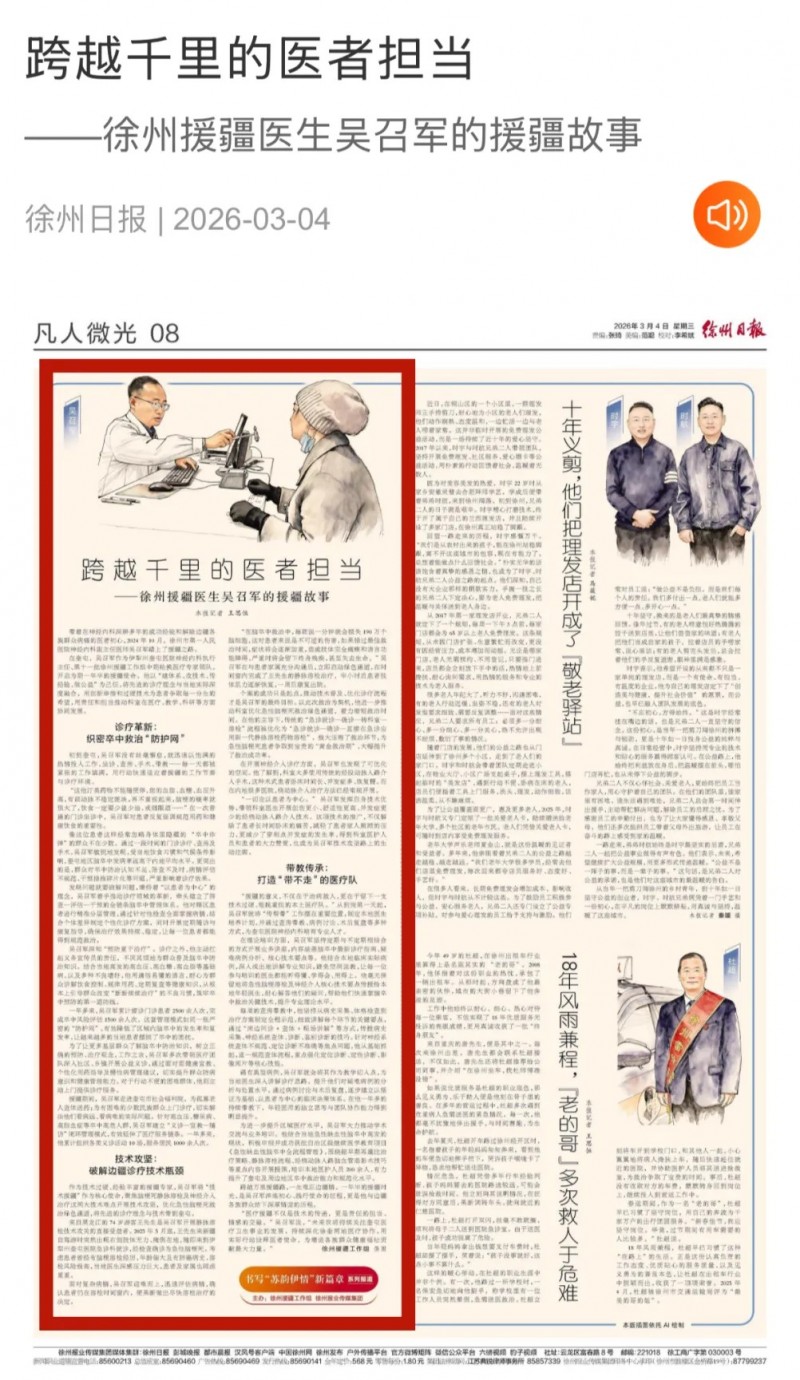 在奎屯,吴召军作为伊犁州奎屯医院神经内科执行主任、第十一批徐州援疆工作组中期轮换医疗专家领队,开启为期一年半的援疆使命。他以“建体系、攻技术、传经验、做公益”为己任,将先进的诊疗理念与当地实际深度融合,用创新举措和过硬技术为患者争取每一分生的希望,用责任和担当推动科室在医疗、教学、科研等方面协同发展。