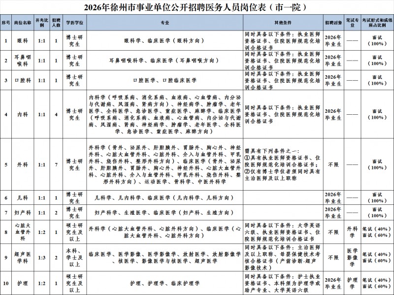 2026年徐州市事业单位公开招聘医务人员岗位表(市一院) |