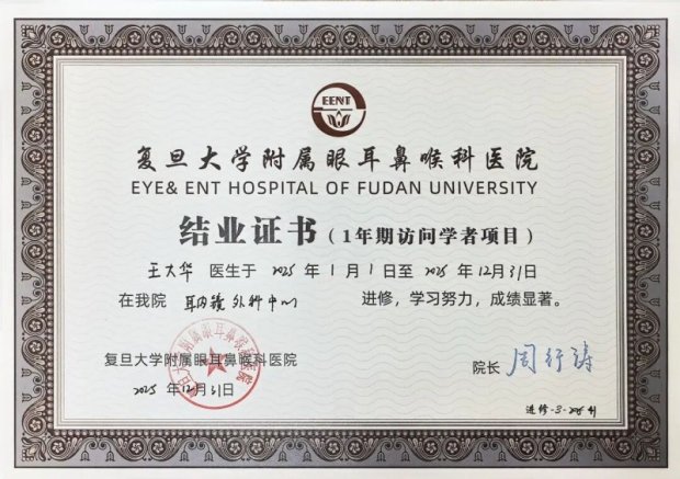 国内进修 2025年1月到12月,我有幸参加了上海复旦大学附属眼耳鼻喉科医院为期1年的访问学者项目。学习期间我师从国内耳鼻喉著名专家王武庆教授,不仅系统掌握了多项前沿耳内镜先...