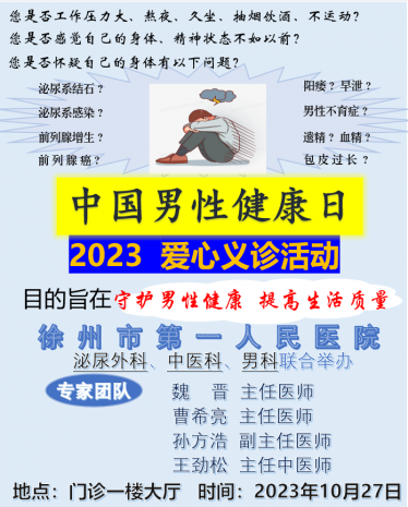 2023年10月28日是第24个中国男性健康日,为普及男性健康科学知识,改善男性健康现状,徐州市第一人民医院泌尿外科、男科、中医科于10月27日上午联合举办了中国男性健康日爱心义诊...